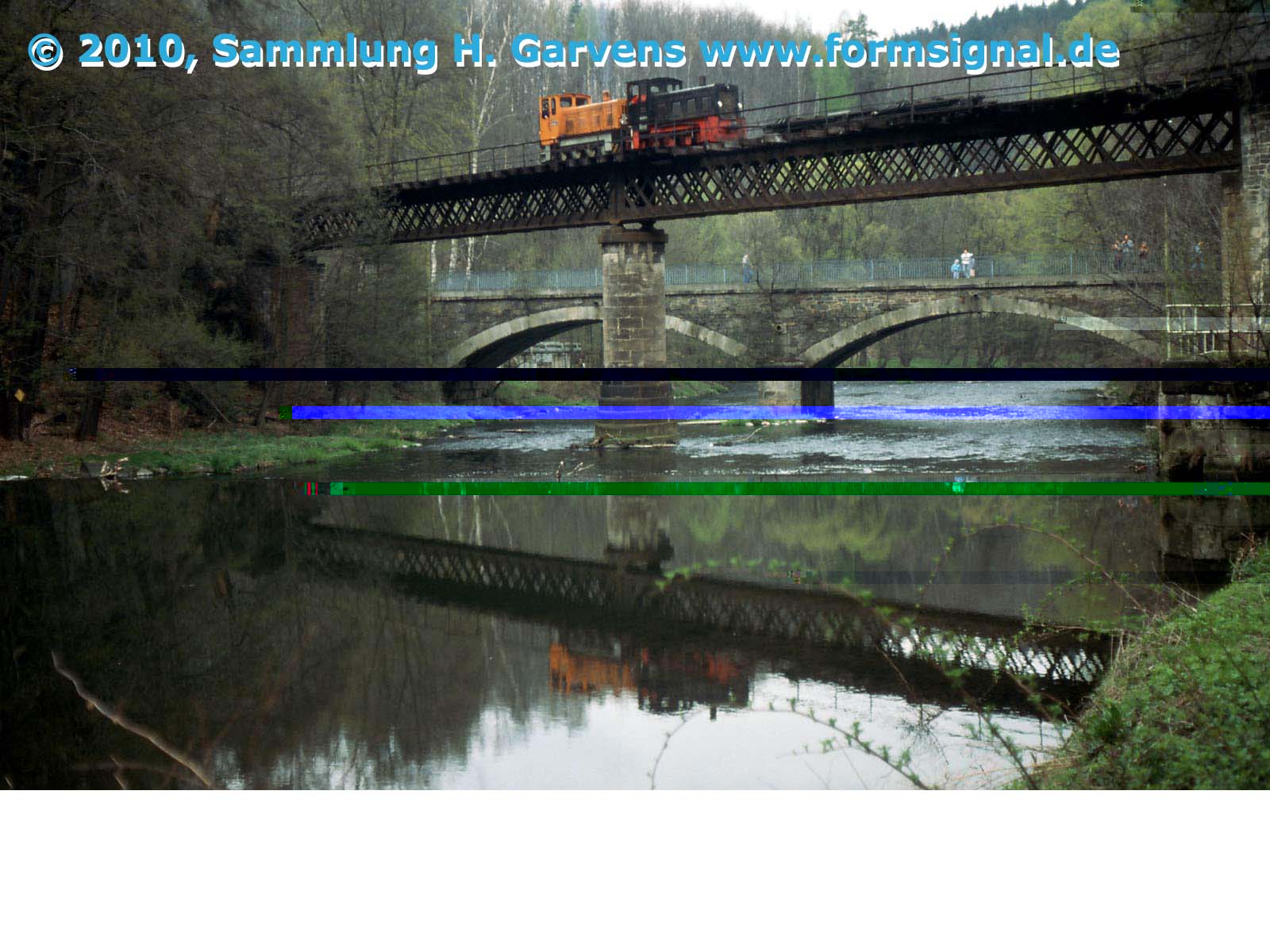Wilischthal am 13.06.1998. Brücke der Schmalspurbahn über die Zschopau, Einlauf zum Fabrikgraben/Energieversorgung (Schmalspurprofile wurden im Zulauf eingerammt, mit Holz verkleidet und dann wurde der Graben zugeschüttet)