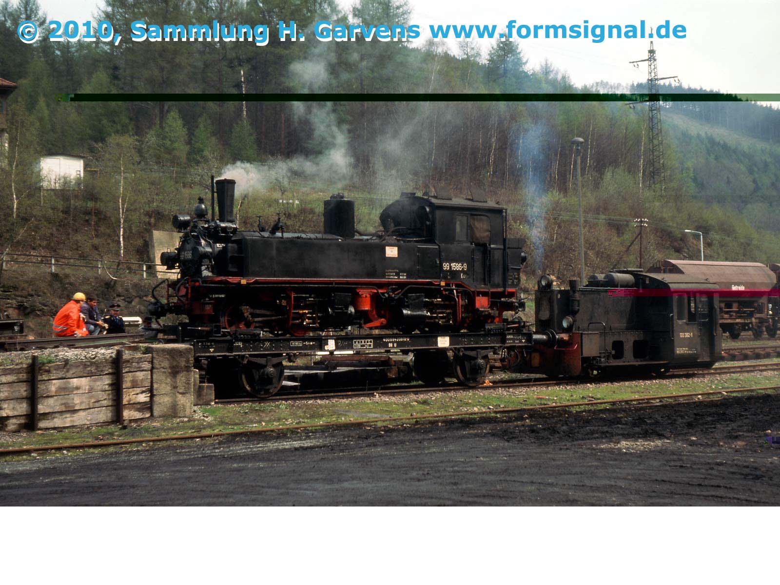 Wilischthal am 02.05.1991. Betriebsmittelrampe. Eine sächsische IV K (99 1586-9), die zu dem Zeitpunkt in Oberwiesenthal beheimatet war, wird vom IV K Schmalspurtransportwagen (40 50 943 5616-0) abgeladen und steht dafür unter Dampf. Die Bahnhofs-Kö des Bahnhofs Wolkenstein (100 382-1) hat die Fuhre an die Betriebsmittelrampe in Wilischthal gebracht.