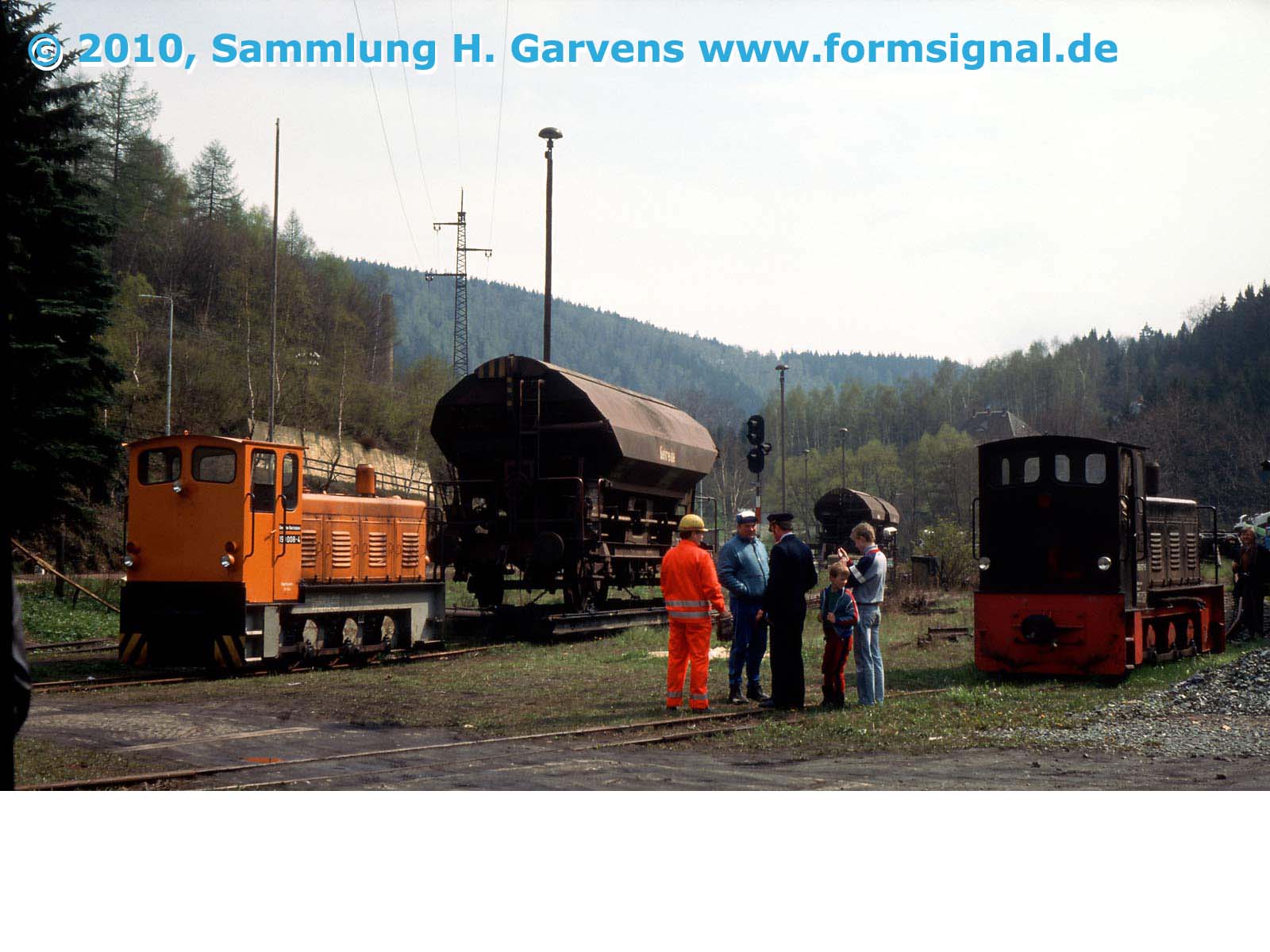 Wilischthal 1991. Der Bahnhof ist noch voll in Betrieb. Neben den Ns4, die beladene Rollwagen für die Papierfabrik seit 19 Jahren vom Bahnhof die 1,6 km zur Fabrik fahren, sammeln sich historische Schmalspurfahrzeuge an, die Vereine hier und in der Papierfabrik abstellen. Alle Fotos von 1991 mit freundlicher Genehmigung von Falk Thomas