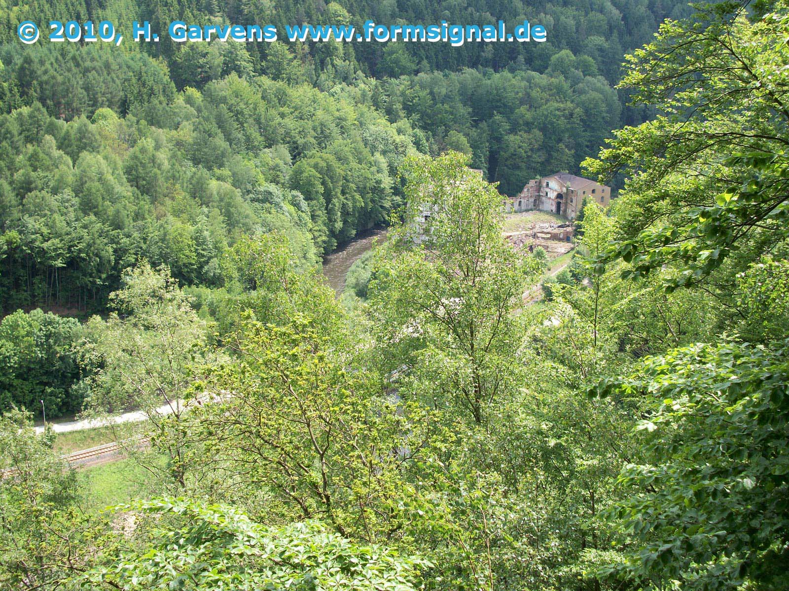 Wilischthal am 06.06.2010. Blick vom Affenstein. Die Bahnhofsfläche, auf der einmal die Rollwagenanlage und die Betriebsmittelrampe standen, wird von der Natur zurück erobert (war Bauplatz 2006). Auch vom Federnwerk stehen nur noch Ruinen.