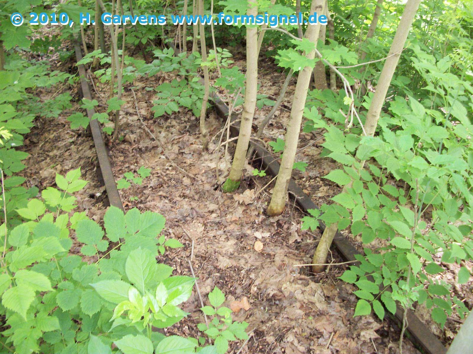 Wilischthal am 06.06.2010. Der Gleisabriss vom Vorjahr wurde unter der Straße nach Gelenau und im anschließenden Dickicht nicht fortgeführt. Dies sind die letzten Meter Streckengleis des ehemaligen Thumer Netzes. Ansonsten finden sich nur noch ein paar Reste am Bahnhof Wilischthal.