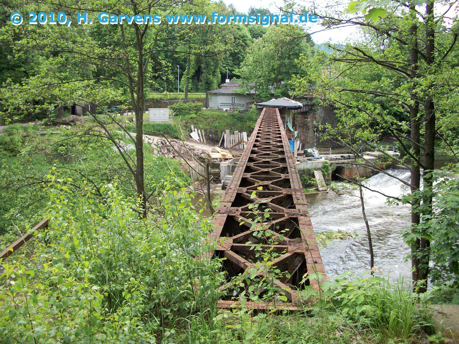 Wilischthal am 06.06.2010. Zschopaubrücke der ehemaligen Schmalspurbahn. Den offensichtlich ausreichend hohen Stahlpreisen fielen 2009 die Gleise auf der Brücke zum Opfer. Am ehemaligen Fabrikgraben wird ein kleines Wasserkraftwerk eingebaut.