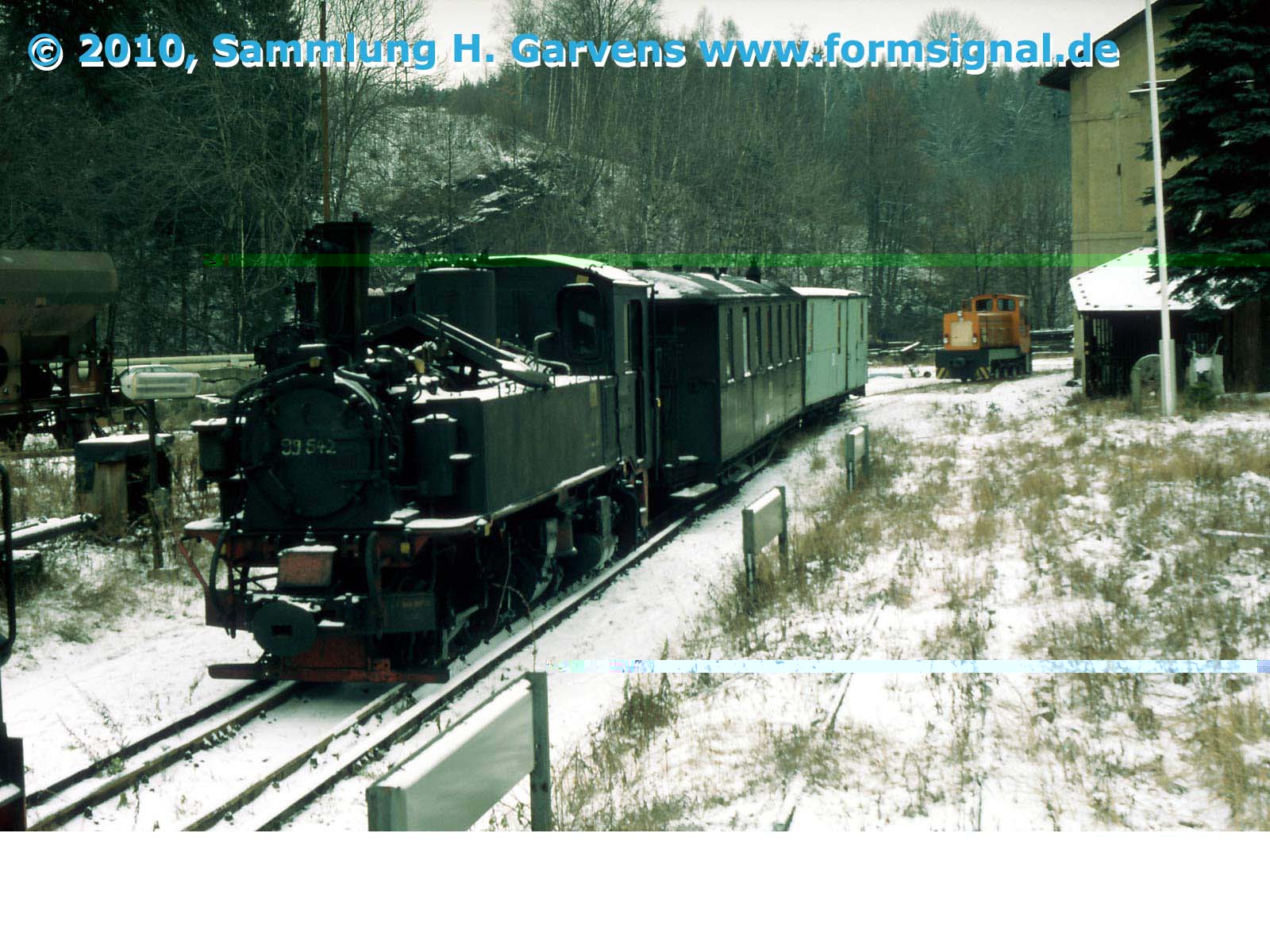 Wilischthal am 14.12.1991. Blick vom Affenstein. Die Gleise des Schmalspur-Personenbahnhofs sind bereits demontiert. Damit ist im Bahnhof kein Umsetzen der Lok mehr möglich, ohne dass der Wagenzug von einer anderen Lok zunächst auf ein anderes Gleis gezogen wird.
