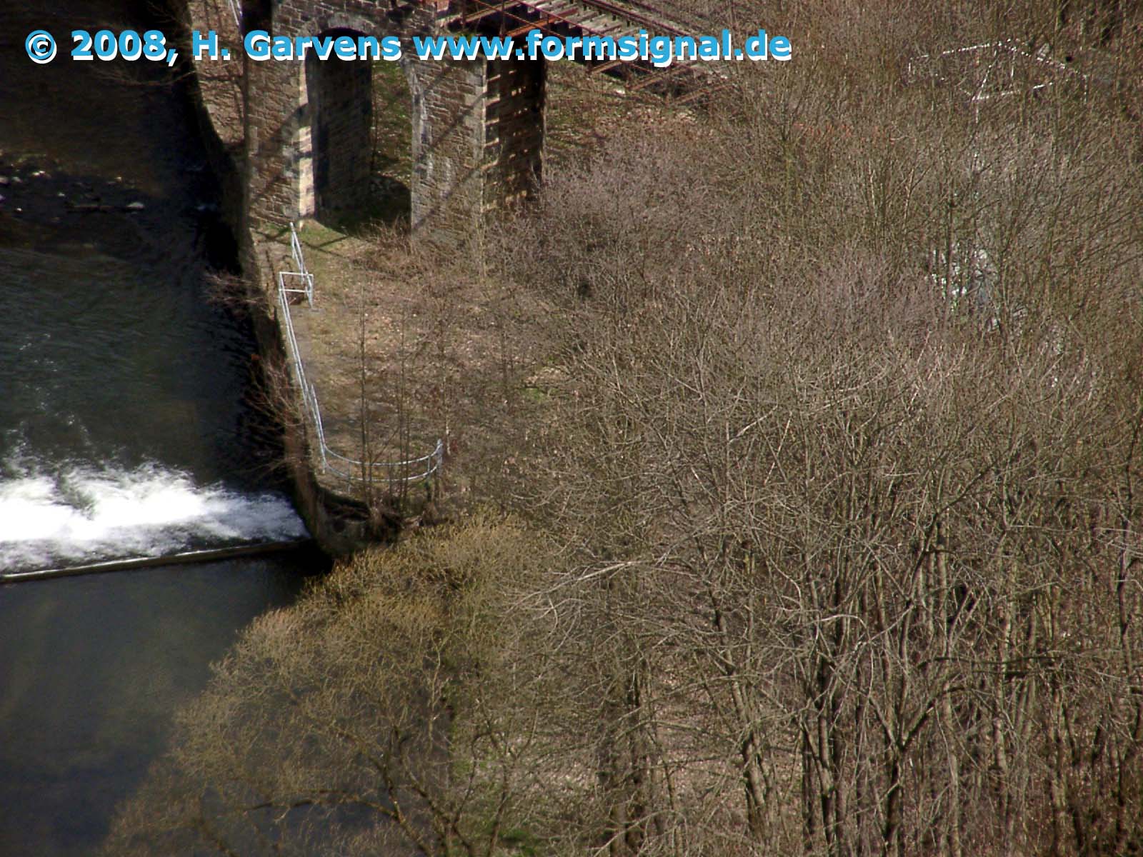 Wilischthal am 12.04.2004. Blick vom Affenstein, Einlauf zum Fabrikgraben des VEB Draht- und Nagelwerkes.