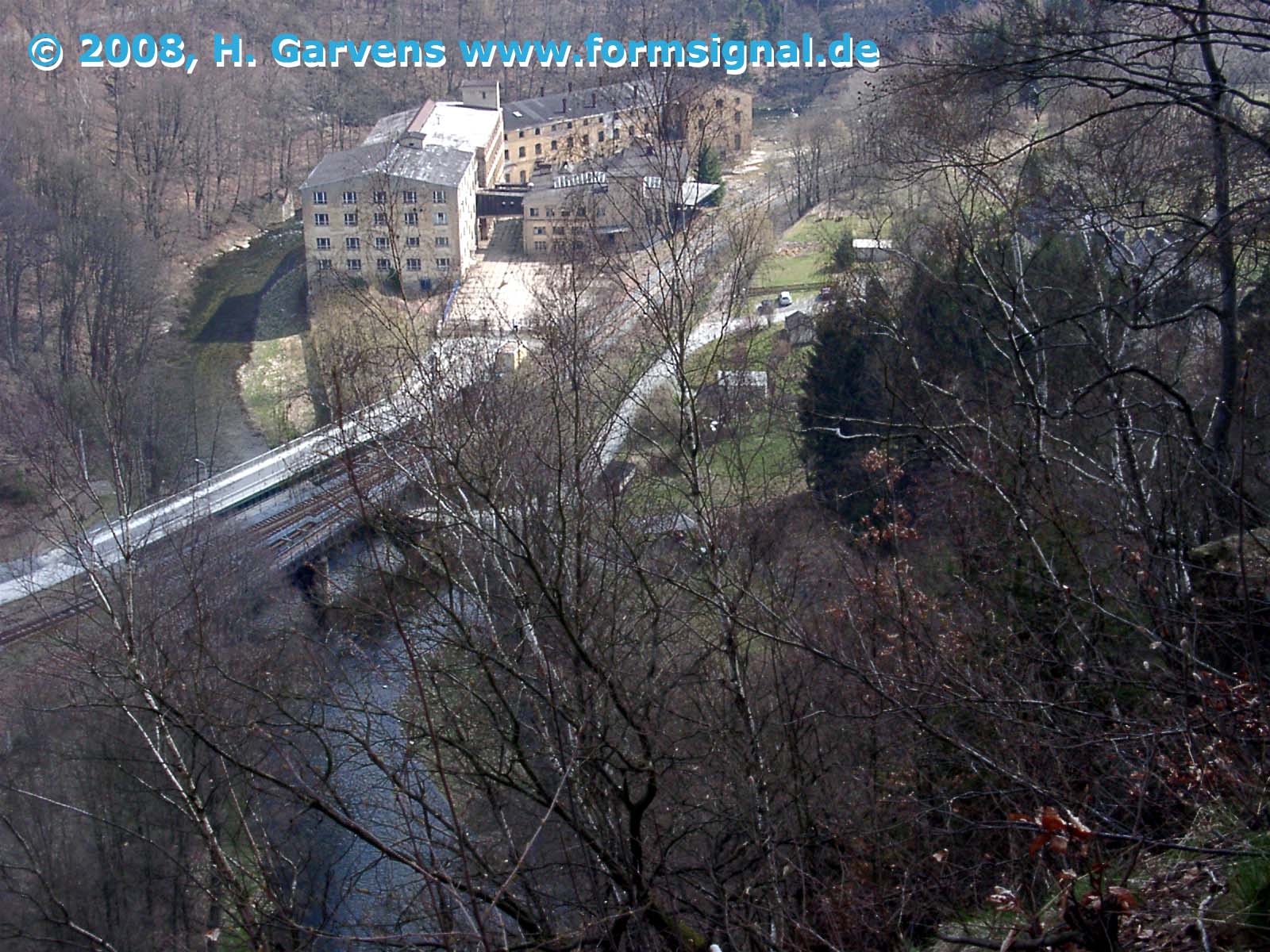 Wilischthal am 12.04.2004. Blick vom Affenstein, Empfangsgebäude in Insellage