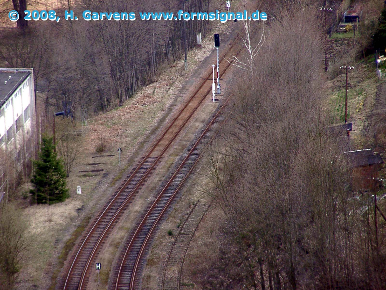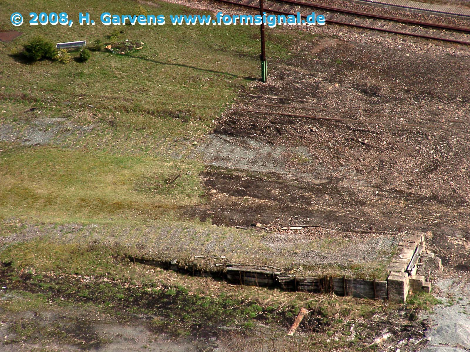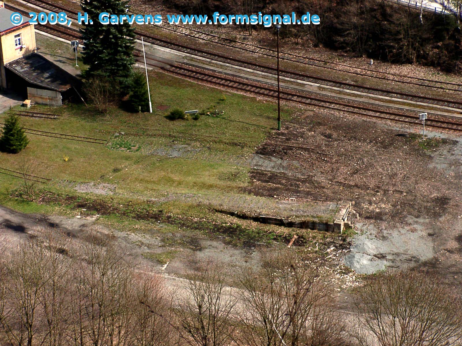 Wilischthal am 12.04.2004. Blick vom Affenstein, nördliche Bahnhofsausfahrt mit Draht- und Nagelwerk. Die Lage des Anschlussgleises lässt sich anhand einiger Schwellenreste noch erahnen. Der Kleinlokschuppen ist verschwunden