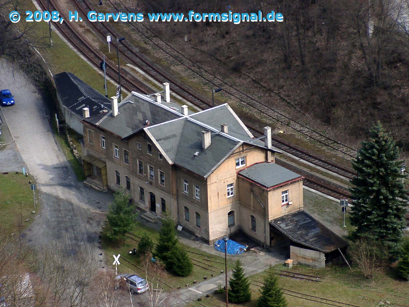 Wilischthal am 12.04.2004. Blick vom Affenstein, Schmalspurgleise am Empfangsgebäude sind noch vorhanden. Die Weichen sind schon lage ins Pressnitztal abtransportiert worden